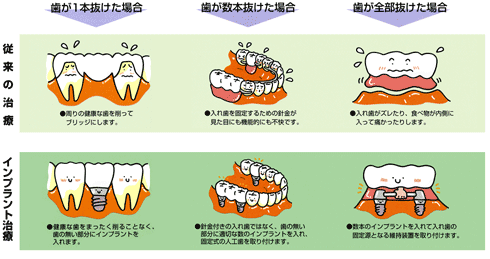 虫歯や歯周病で歯を抜いてしまったあと、歯を入れるのには3つの方法があります。 取り外しができる入れ歯にするか、歯の無いところの両横の自分の歯を削ってブリッジという固定式の金属をつくるか、そしてインプラントにするか、です。入れ歯は歯肉の上に乗っているのでかんだときに沈み込み、かんでも力が出ません。また汚れがつきやすく、毎食後はずして洗う必要があります。固定式のブリッジは両横の歯を削らないといけません(削れば必ず寿命は短くなります)。ブリッジは7年ほどでやりかえることが多いというデータがあります。良い点は、入れ歯もブリッジも健康保険の適用があるということです。(一部保険がきかない場合もあります)